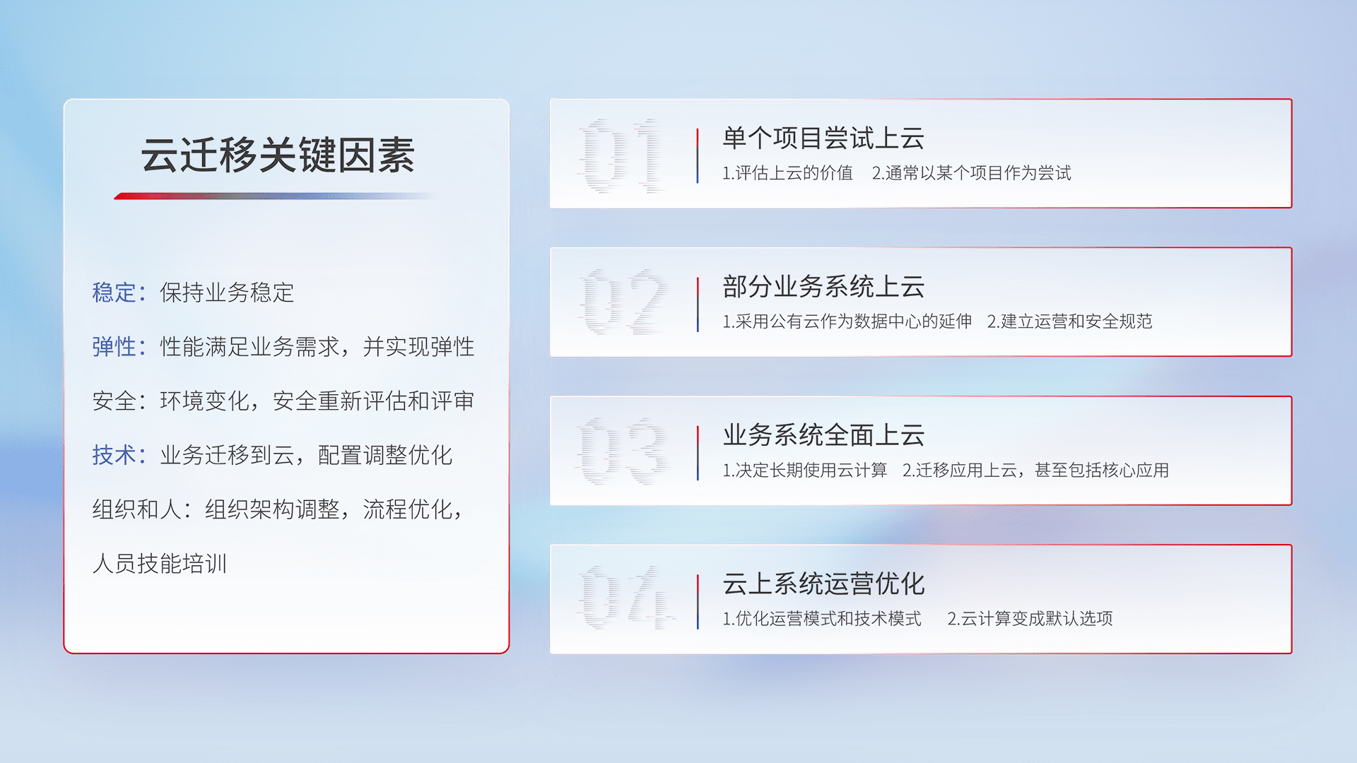 结合实际业务,,,从规划设计、、、、云平台选型、、、、云原生改造、、数据迁移、、集成交付,,迁移全过程为客户识别最佳上云路径,,,做好风险识别管理,,设计网络架构、、身份权限、、、安全审计合规、、、、操作审计、、、、日志审计、、、监控告警策略、、多站点容灾设计等,,,,对云上基础设施进行整体规划,,,,提升IT治理水平,,以满足弹性、、、高可用、、高性能的需求。。。。