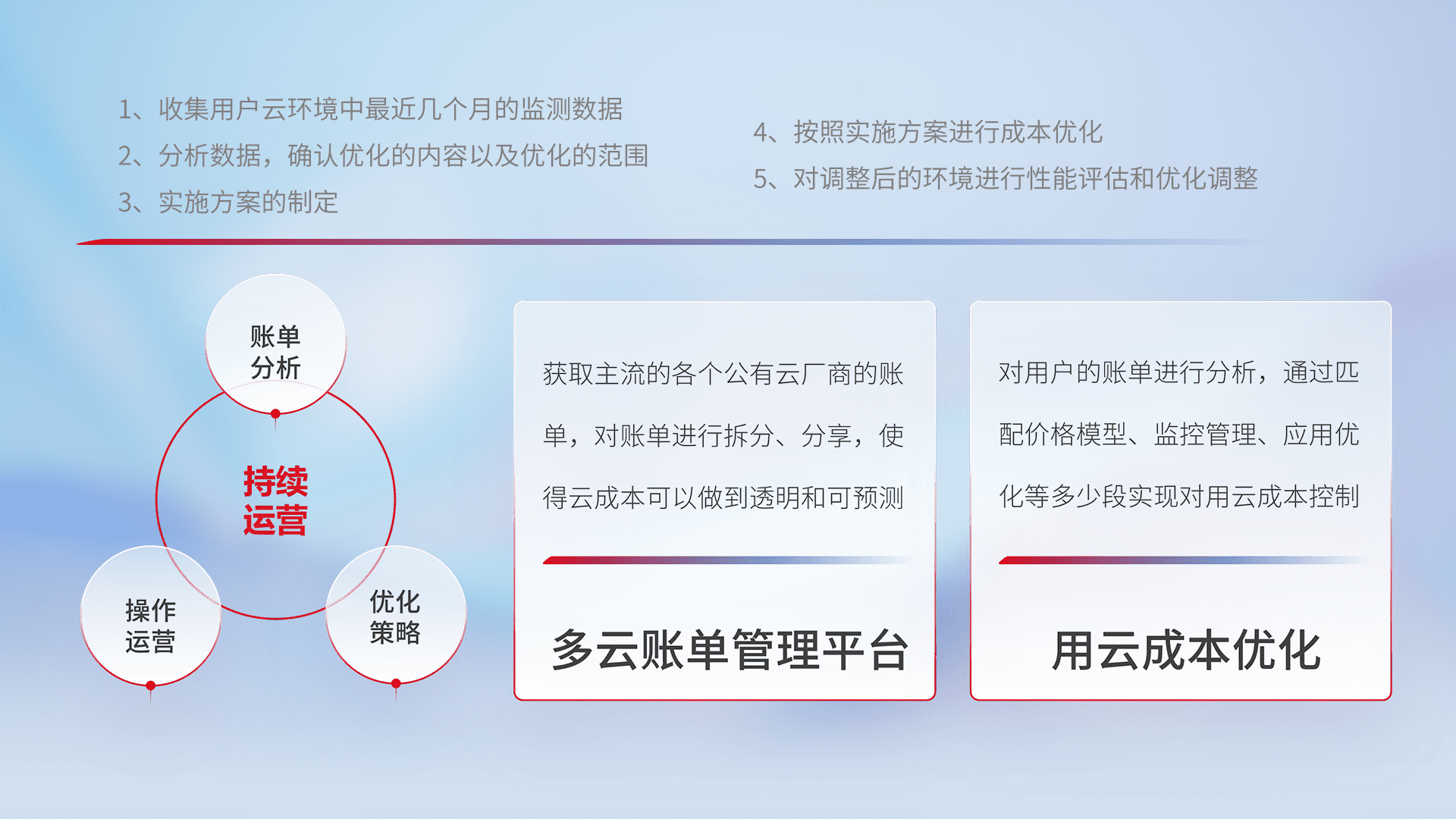 通过多云纳管,,以统一的资源数据模型把客户的云资源进行抽象和封装,,,进而实现对多云资源的统一操作,,,保障云资源管理的可靠性、、稳定性与可用性。。。量身定制化运维内容,,,,配置、、、开发运维、、、、补丁管理、、备份、、、、监控、、认证和访问管理、、审计和日常巡检等,,保障在用云过程中的可靠度,,,,稳定度以及高可用率。。。。